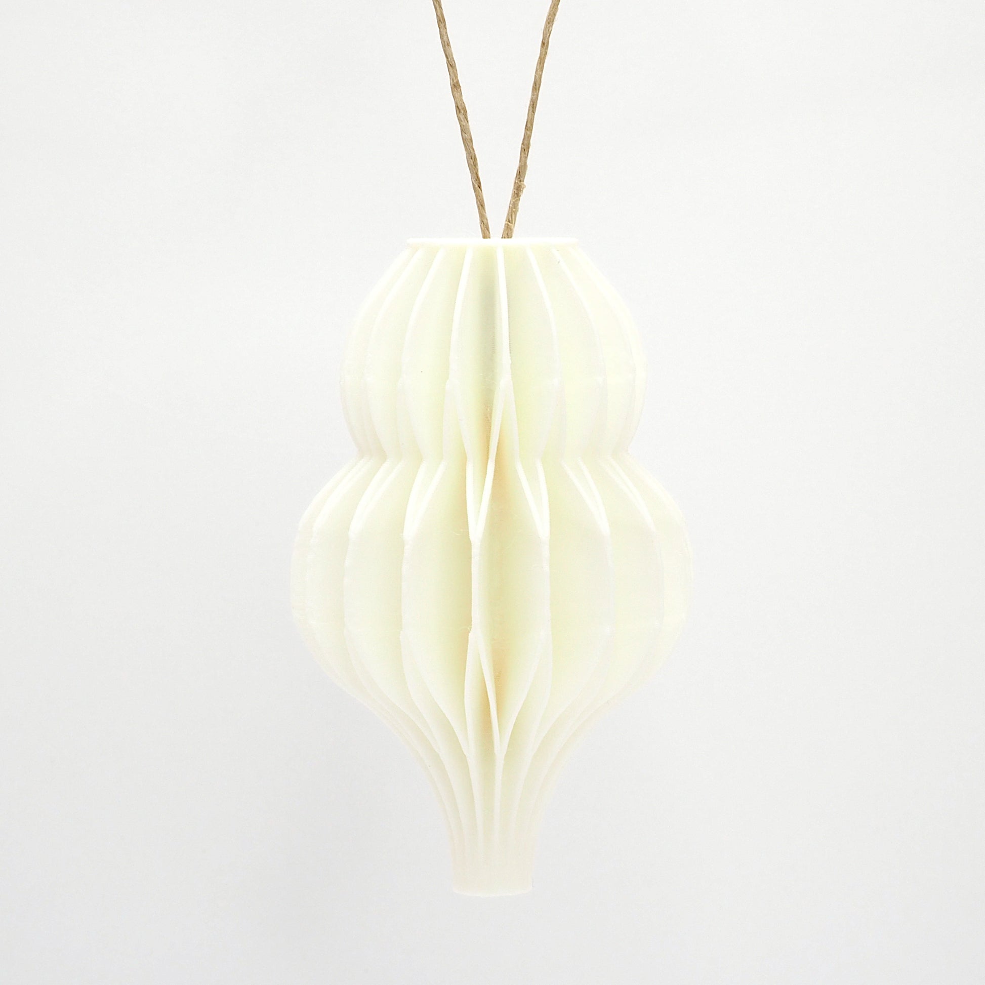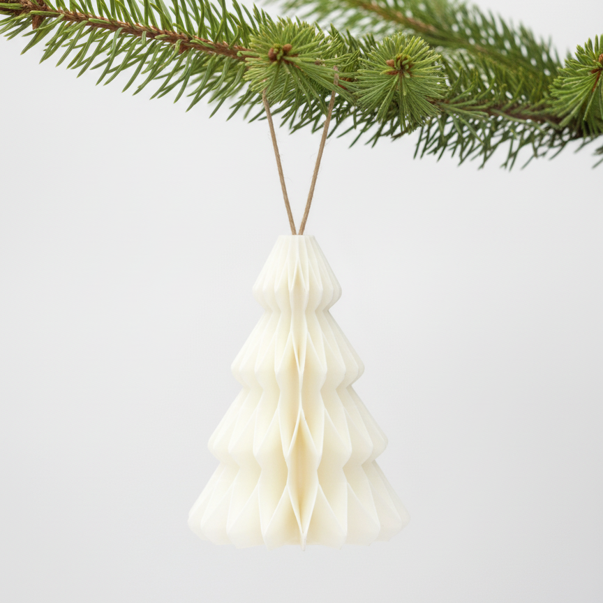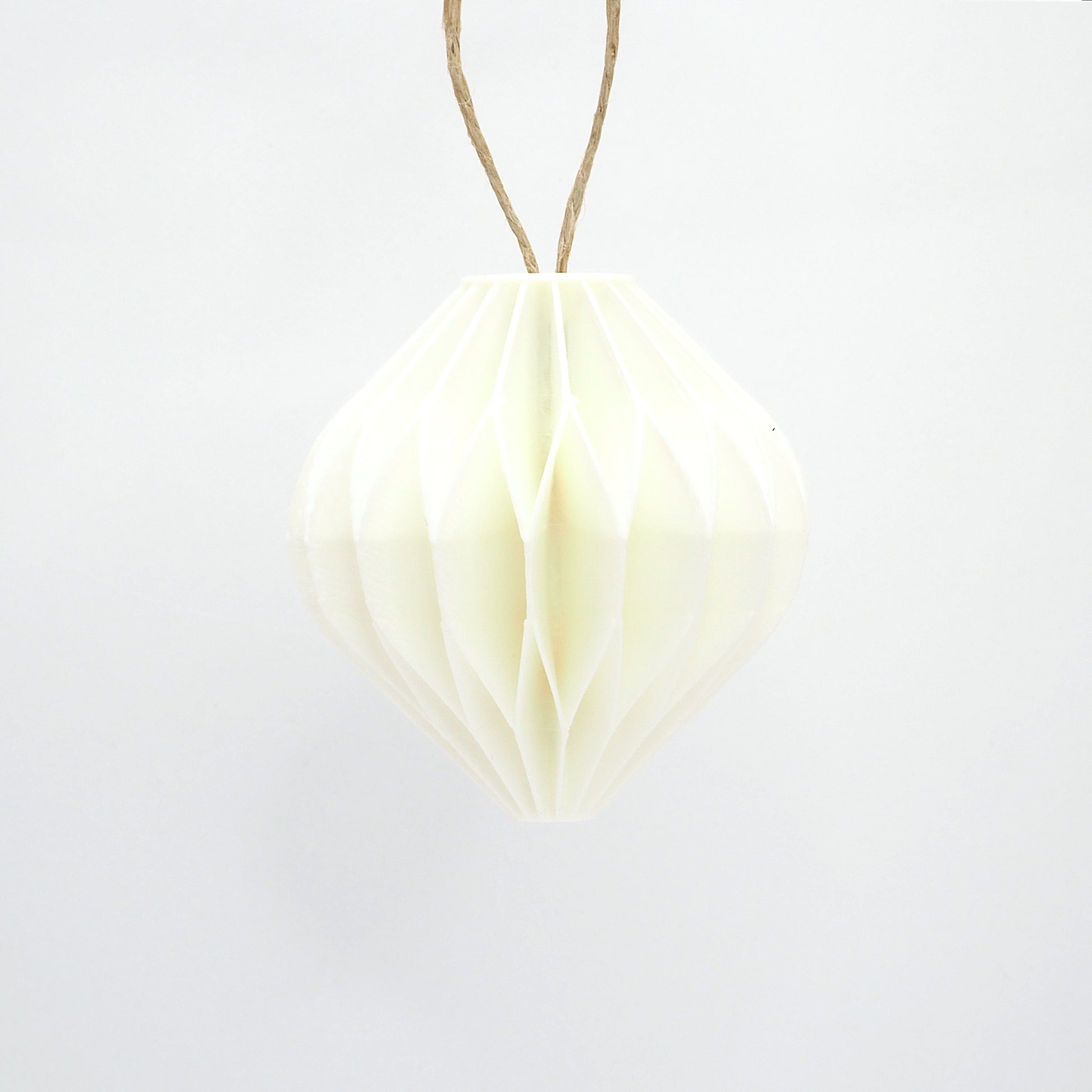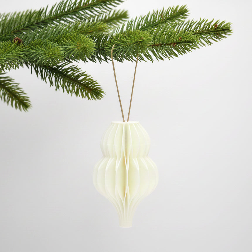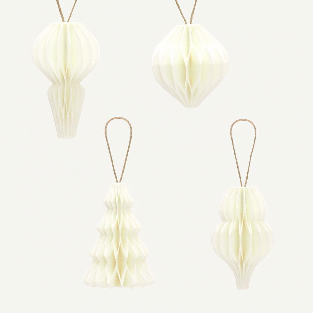 Julepynt i honeycomb-foldet stil, inspireret af de klassiske papirornamenter, men her genskabt i et roligt og tidløst 3D print. De bløde former giver et varmt udtryk på juletræet, i vinduet eller på en gren. Små detaljer, der forener nostalgi og moderne dansk design i en enkel og harmonisk form. Kommer som én pakke med fire forskellige designs.