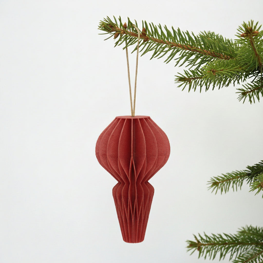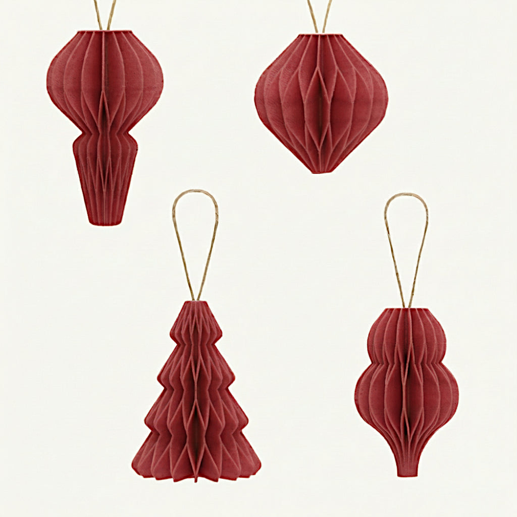 Julepynt i honeycomb-foldet stil, inspireret af de klassiske papirornamenter, men her genskabt i et roligt og tidløst 3D print. De bløde former giver et varmt udtryk på juletræet, i vinduet eller på en gren. Små detaljer, der forener nostalgi og moderne dansk design i en enkel og harmonisk form. Kommer som én pakke med fire forskellige designs.