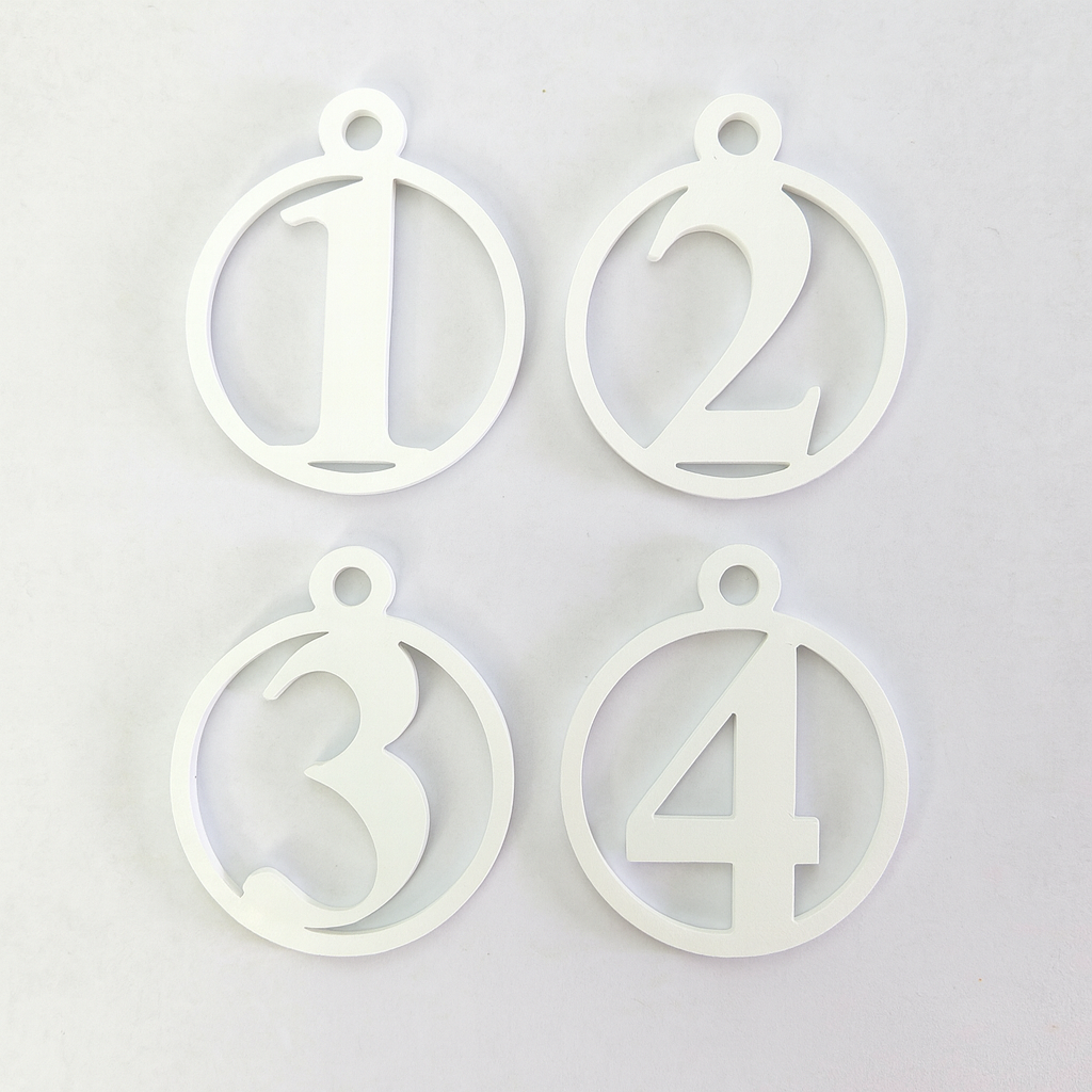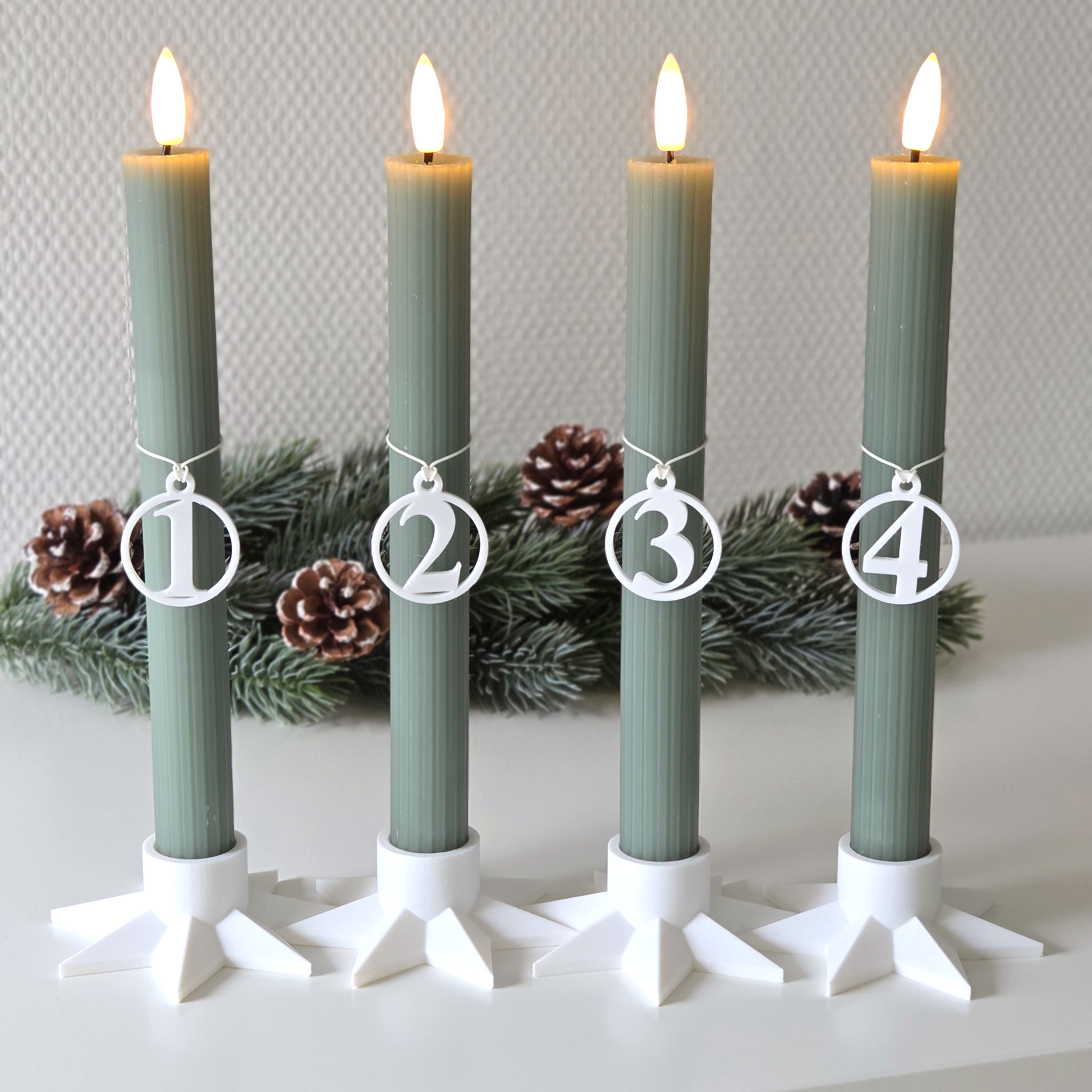 Adventstal lille - Marker julens adventssøndage med vores Adventstal i hvid – fire tal, der kan hænges på lys, gaver eller bruges som dekoration. Produceret i Danmark og 3D-printet på bestilling i plantebaserede materialer, kombinerer de bæredygtighed og dansk design i en tidløs julepynt.