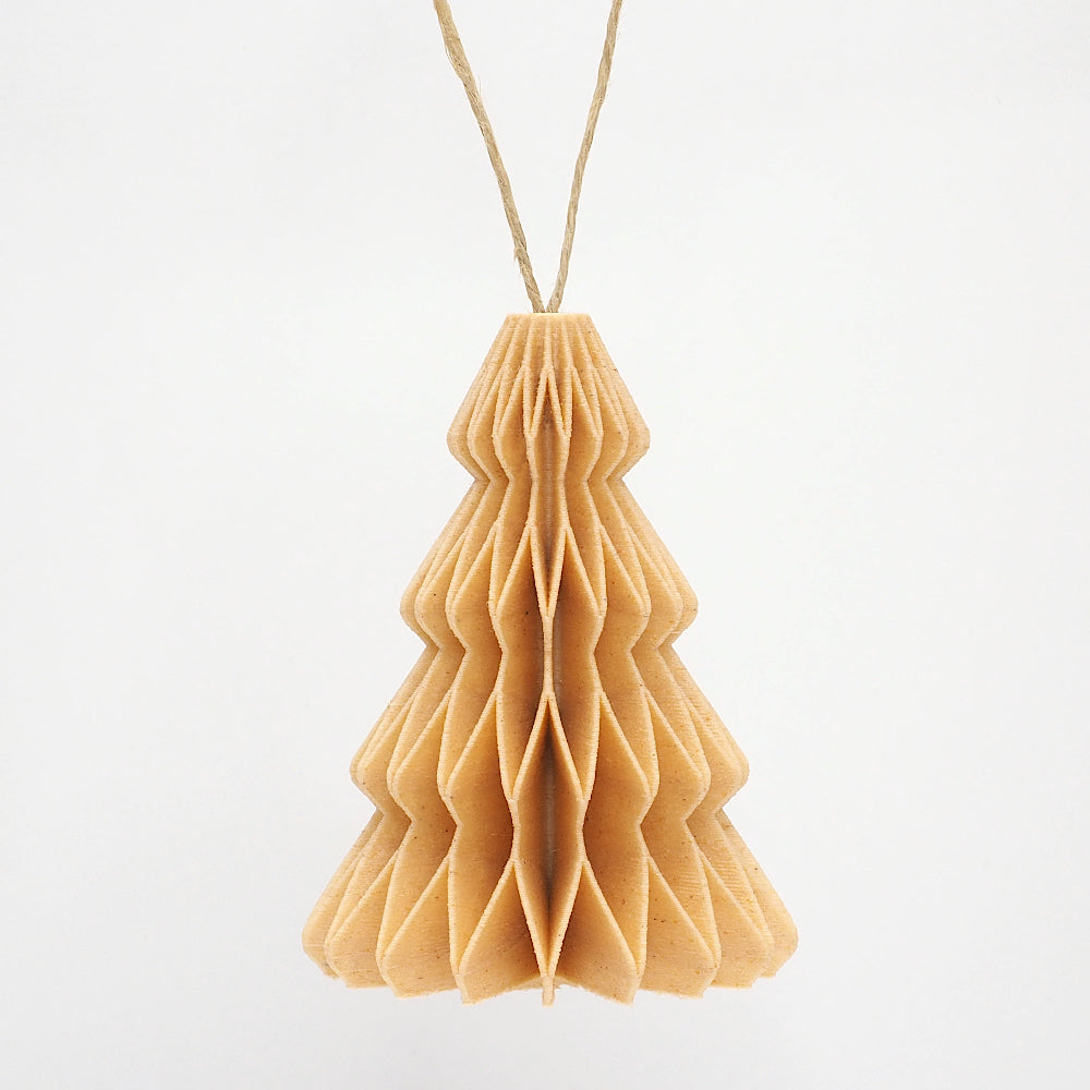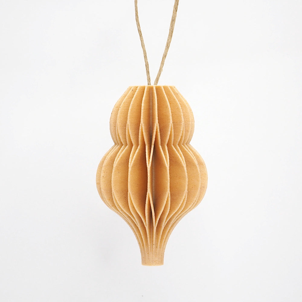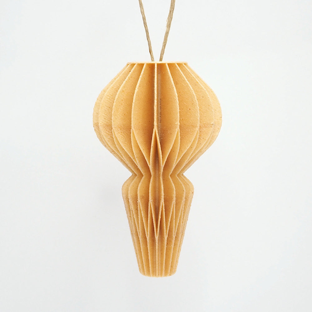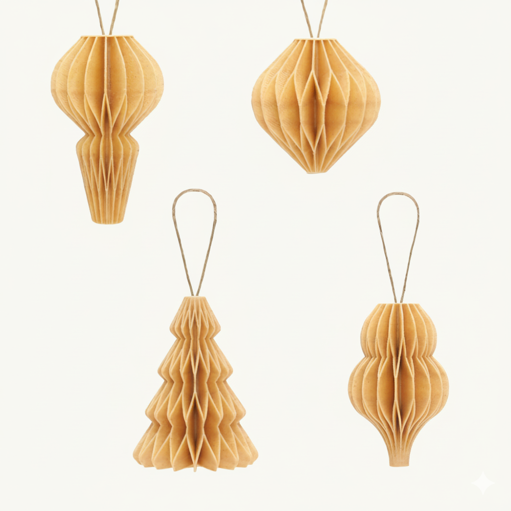 Julepynt i honeycomb-foldet stil, inspireret af de klassiske papirornamenter, men her genskabt i et roligt og tidløst 3D print. De bløde former giver et varmt udtryk på juletræet, i vinduet eller på en gren. Små detaljer, der forener nostalgi og moderne dansk design i en enkel og harmonisk form. Kommer som én pakke med fire forskellige designs.