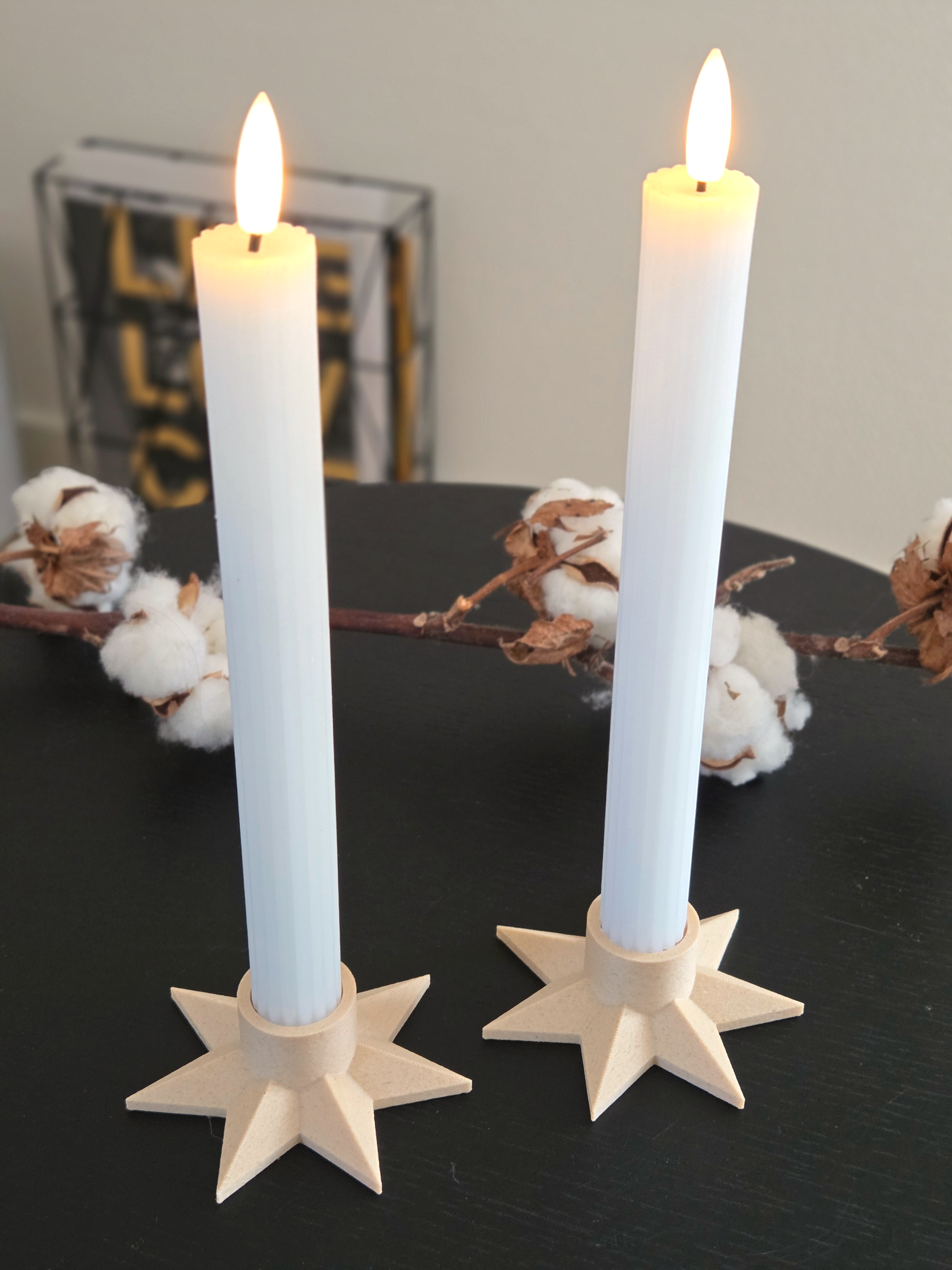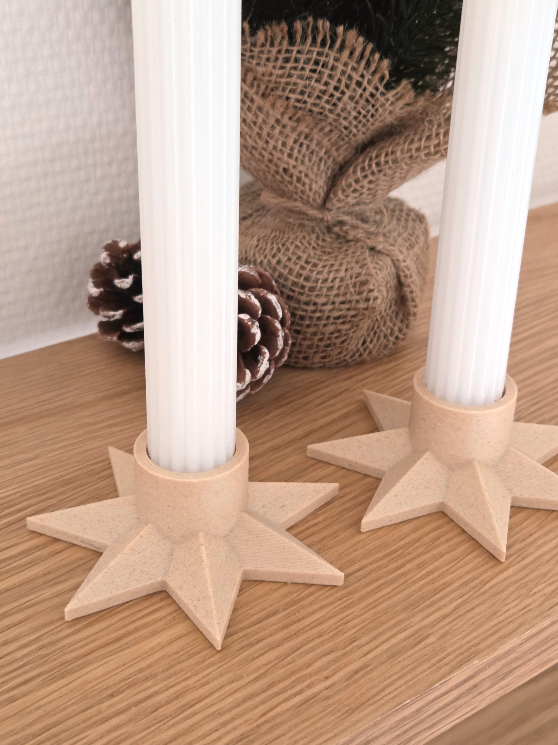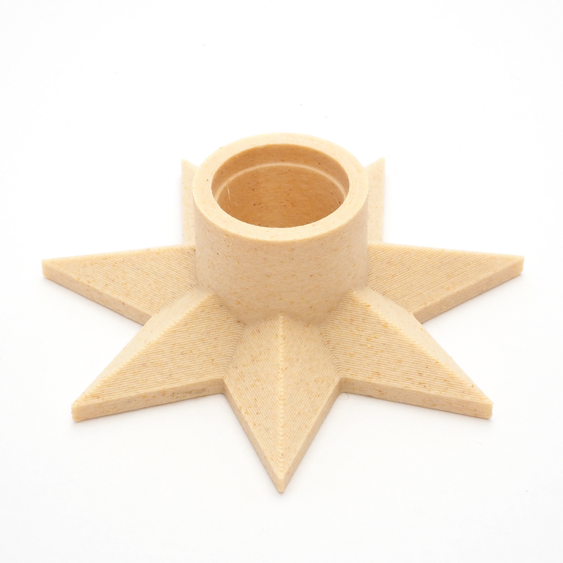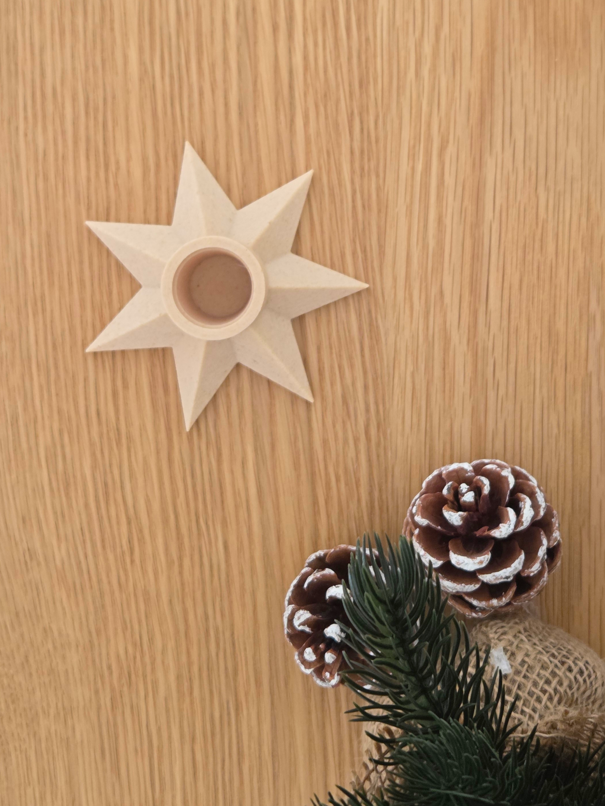 Julestjerne lysestage - Skab julestemning med vores Julestjerne lysestage i birk – en dekorativ stage, der spreder roligt lys gennem sit stjerneformede design. Fremstillet i Danmark og 3D-printet på bestilling i plantebaserede materialer forener den bæredygtighed og dansk design i en tidløs juledekoration til bord, vindue eller gave.