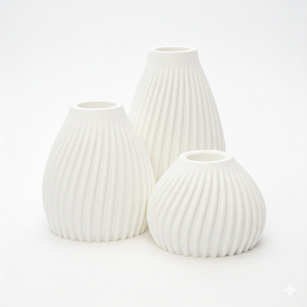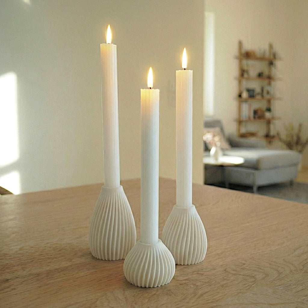 FLUTE lysestagesættet består af tre lysestager i forskellige højder med bløde, bølgende riller, der skaber et roligt og harmonisk udtryk. De er designet til LED kronelys og giver mulighed for at skabe hygge på både bord, hylde og vindueskarm. Brug dem samlet for et fuldendt designudtryk eller hver for sig for en let og enkel stemning i hjemmet.