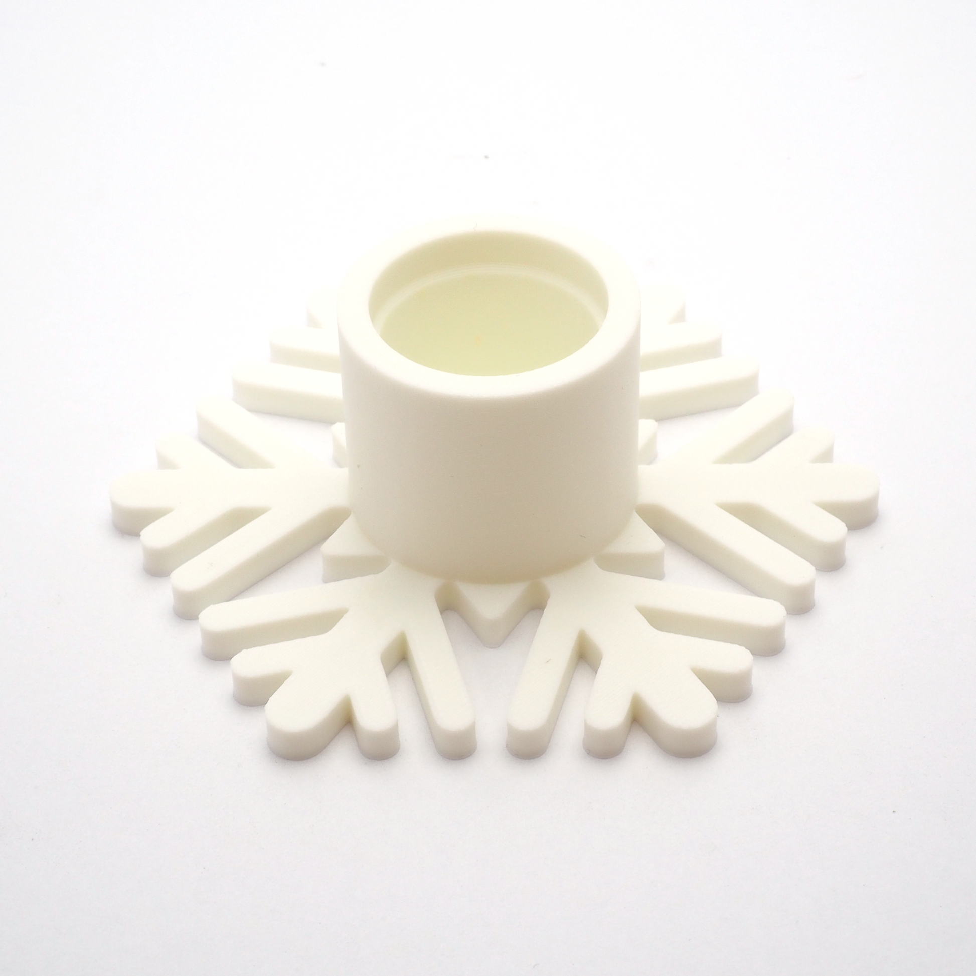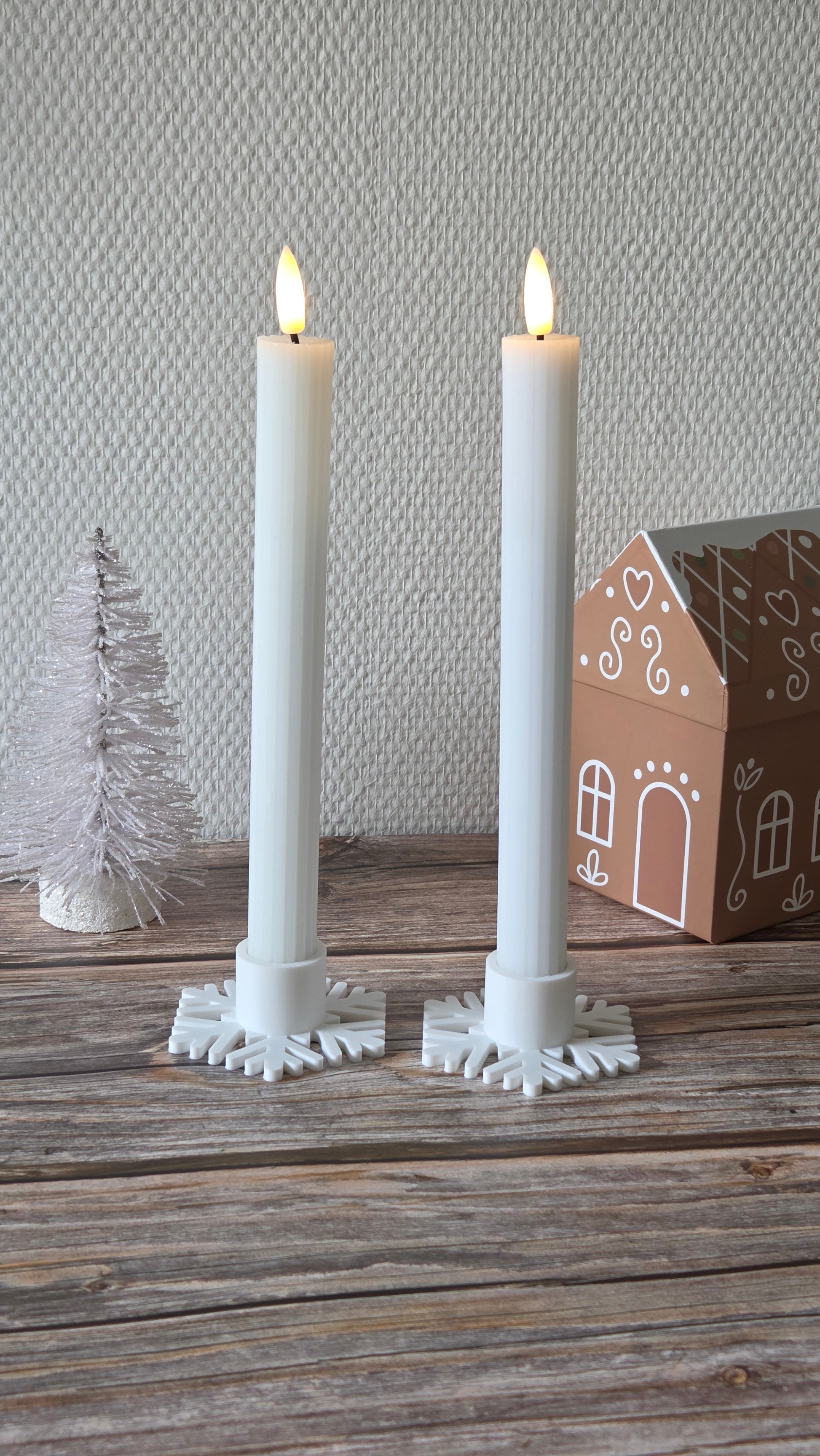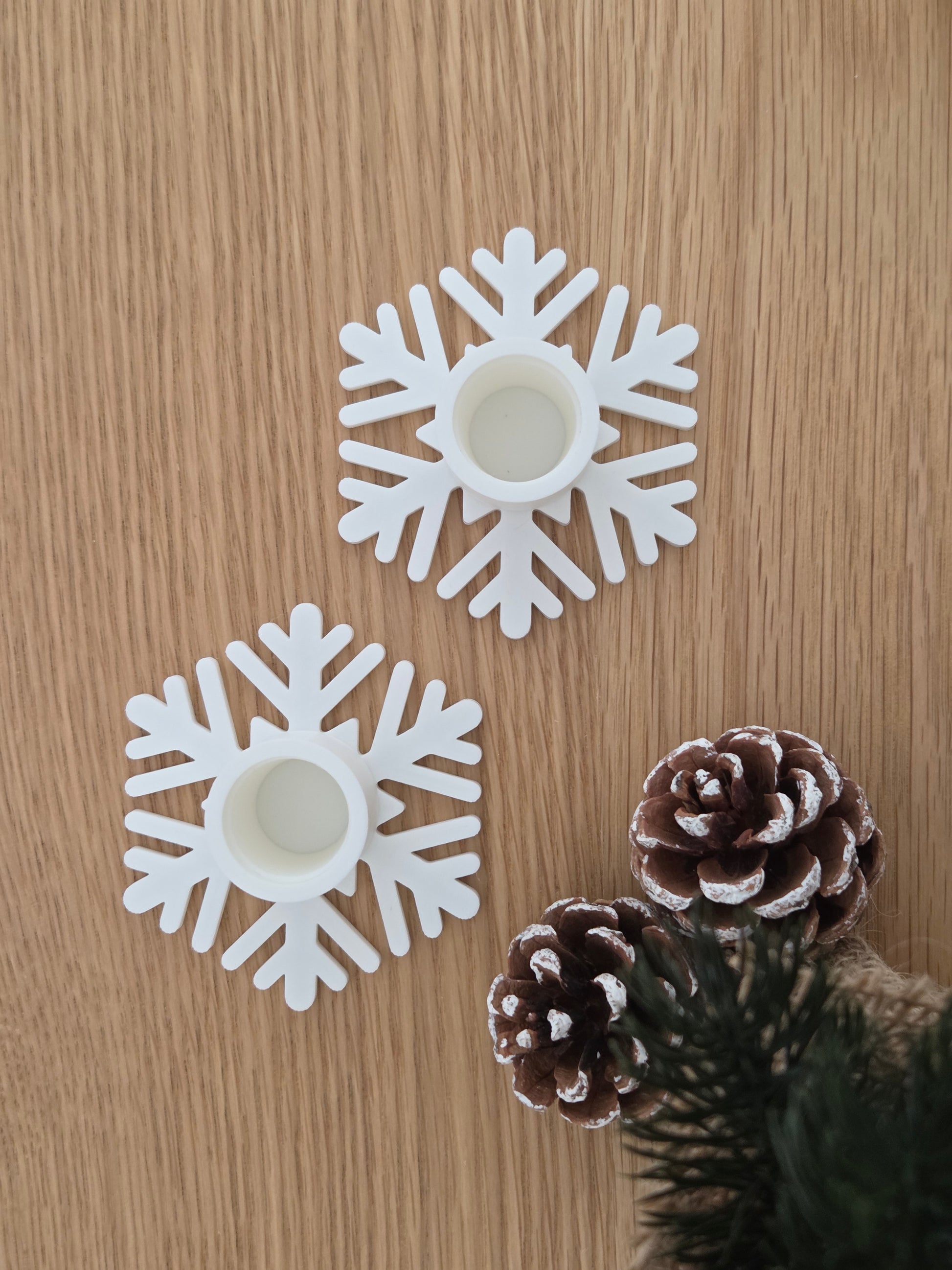 Snefnug lysestage - Den hvide Snefnug lysestage til kronelys bringer vinterens lethed ind i hjemmet med sit enkle stjerneformede design. Fremstillet i Danmark og 3D-printet på bestilling i plantebaserede materialer, forener den bæredygtighed og dansk design i en tidløs juledekoration til bord, vindue eller gave.
